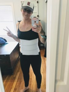 I pretty much slept the entire day away! I was super tired and my breast/stomach region was definitely sore. But good news is my back is feeling SO much better today and I’m taking Advil around the clock which helps take the edge off. The Bolducs were a huge help today! Kim brought Andi to dance class and then Jamie and Joey kept the kids busy playing outside which was really nice to have a quiet home to recover in! My sister also delivered a turkey wrap from pizza market which made my day. Thank you guys!! My outfit these days include high waisted spanx, abdominal binder and tight tank. The compression is good for healing but dang I feel like I’m wrapped up in a cocoon!!