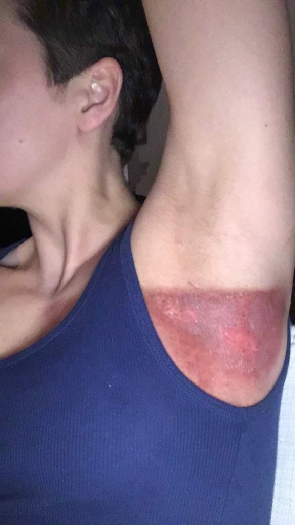 Oh my!! So the radiation burns are starting to become super painful!!!! The actual breast area is tolerable but under my armpit KILLS! The skin is like a dark red/maroon color and is starting to peel!!! So I have a ton of open areas. On days I stay home I don’t even bother wearing a bra and actually have been wearing Jamie’s tshirts! The baggier the better!! I find myself just lifting my arm up to the side all day so it doesn’t hit my pit lol! I yi yi! Currently in bed… took 800mg of Advil, smeared a thick layer of lidocaine cream on, and wrapped an ice pack under my pit. I was able to sleep through the night yesterday and did the following so I’m praying it works tonight 🙏 I called Lisa today (Dr. Browers nurse) and it sounds like it should get better from here on out. Also she will be asking Dr. Brower to prescribe more lidocaine cream because I’m getting low. The fatigue is also sticking with me. I find myself doing TV time with the kids a little more often then usual lol! And some days I can barely stay awake. It’s like way worse then chemo fatigue. I literally go from 100 to 0 in seconds!